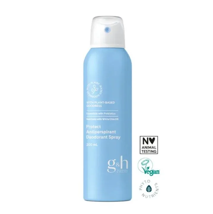 g&h Protect Deodorante Spray Antitraspirante è un deodorante spray antitraspirante ad assorbimento rapido con prebiotici e olio di chia bianca che protegge dai cattivi odori e dal sudore, lasciando una sensazione di fresco e asciutto sotto le ascelle.